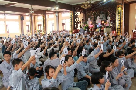 Sau bài giảng pháp của Thầy Trụ Trì là thời khóa sám hối sáu căn của Đoàn TNPT. Các bạn sinh viên rất tò mò và bỡ ngỡ khi đến thiền viện lần đầu tiên. Đây là lần đầu tiên các bạn được tham gia tụng kinh sám hối, được tọa thiền và tham dự lễ hằng thuận, được Quý Thầy giảng giải về tình yêu đôi lứa.