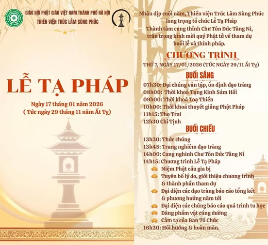 Vào ngày Thứ bảy 29 tháng 11 năm Ất Tỵ (17.01.2026), Thiền viện Trúc Lâm Sùng Phúc tổ chức Lễ tạ pháp năm Ất Tỵ, tổng kết một năm tu học của đạo tràng và đưa ra các chương trình tu học mới cho năm tiếp theo.