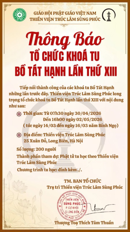 Tiếp nối thành công của các Khóa Tu Bồ Tát Hạnh trong những lần trước đây, Thiền Viện Trúc Lâm Sùng Phúc long trọng tổ chức Khóa Tu Bồ Tát Hạnh lần thứ XIII với nội dung như sau: